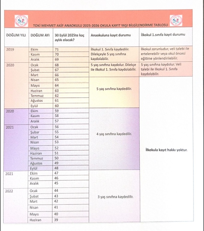 2025-2026 eğitim öğretim yılı kayıtlarımız başlıyor. Okulumuzda 3 yaş, 4 yaş, 5 yaş grupları öğrenci kayıtlarımız olacaktır.